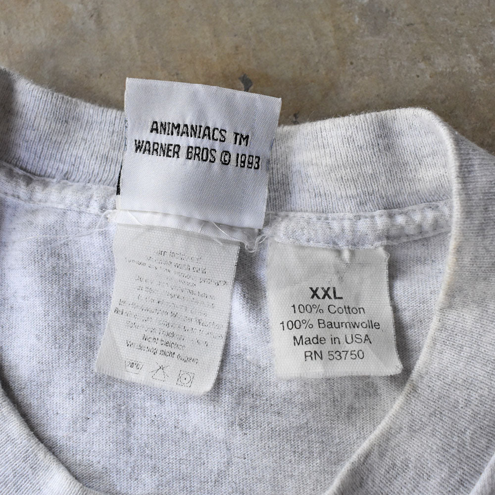 タグは「ANIMANIACS」名義で、Made in USA、100%コットン。ライトグレーのボディに発色の良いプリントが映える一枚です。ボリューム感のあるXXLサイズで、ゆったりとしたシルエットも魅力。