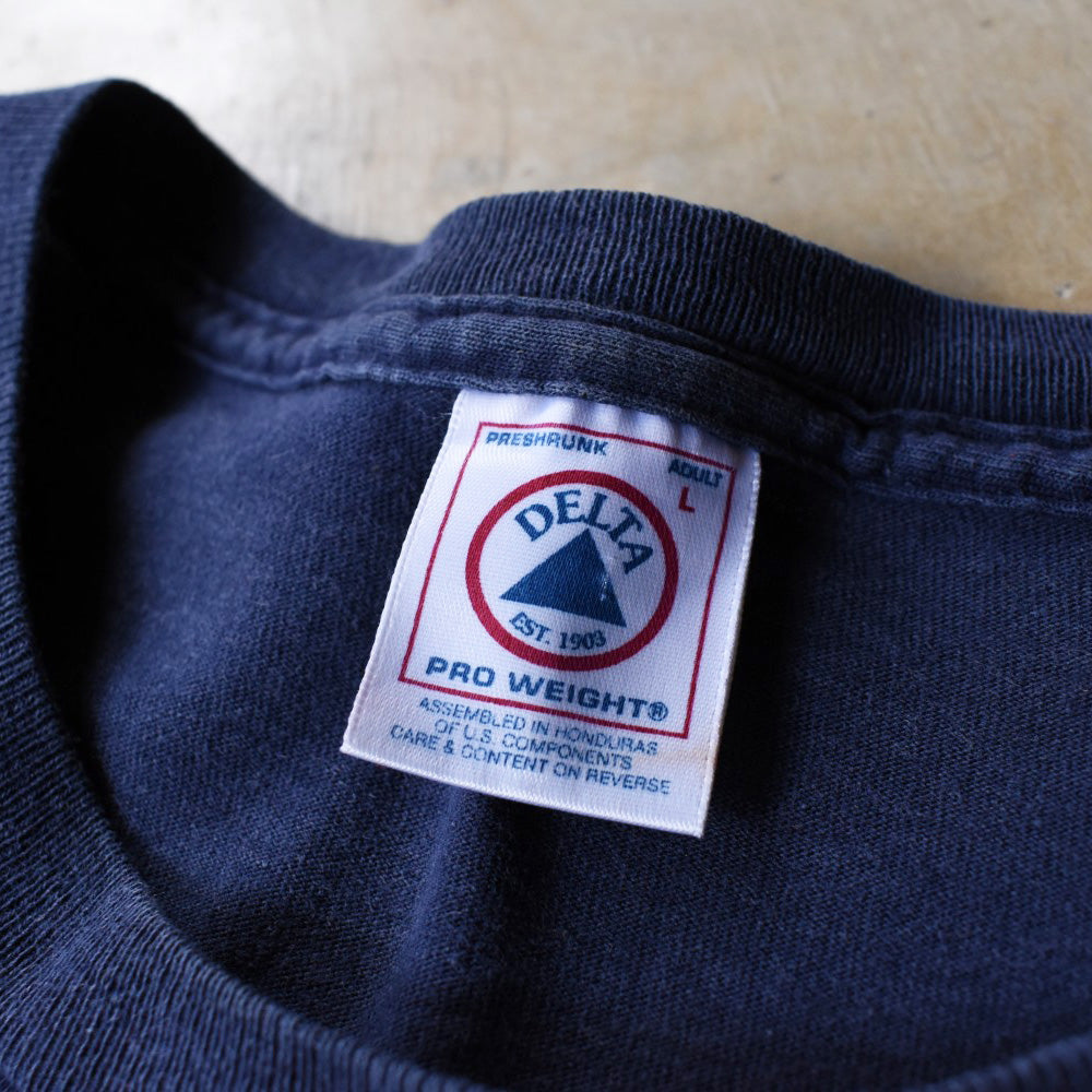 DELTAボディのざらっとしたコットン、少し褪せたネイビー、太いフォント。