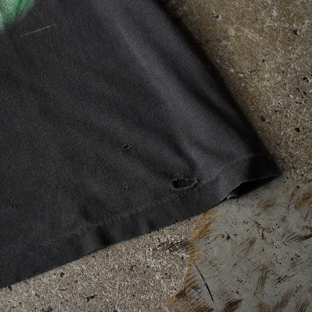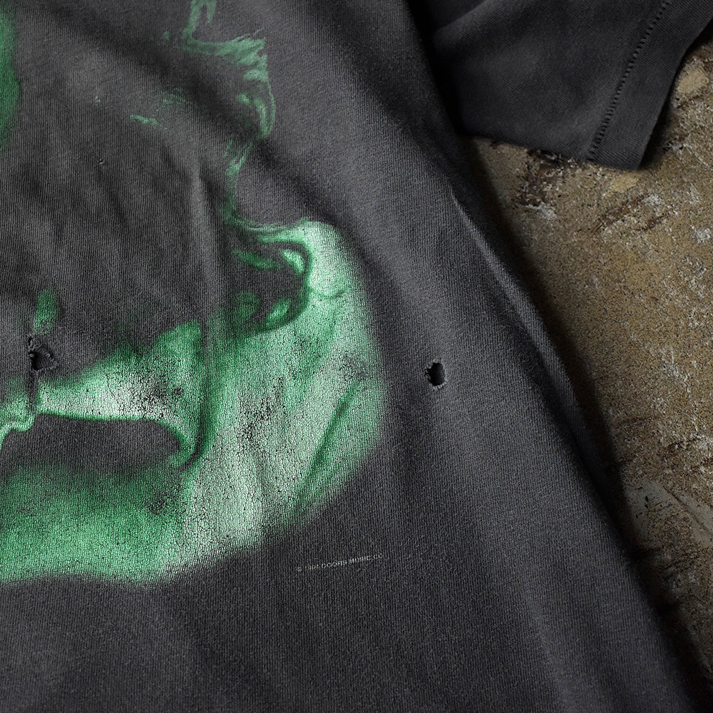note..USアートロックバンドThe Doorsのフロントマン、ジム・モリソンTシャツ。存在感抜群のビッグフォトが大胆にデザインされた1枚。ブラックボディに映えるグリーンカラーのプリントも独特な雰囲気。94年コピーライト入り。袖、裾シングルステッチ。時代を超えて語り継がれるロックスター、ジム・モリソンTシャツです!