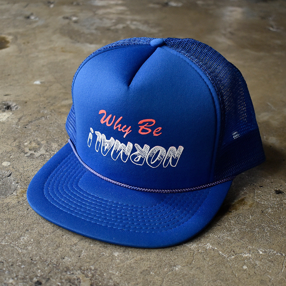 note...“Why Be Normal!”(普通でいるなんて、つまらない)、挑発的でユニークなメッセージプリントのメッシュキャップ。デッドストック。鮮やかブルーボディに通気性の良いメッシュ素材。スタイリングにひとクセ加えてくれる、遊び心たっぷりのアイテムです。