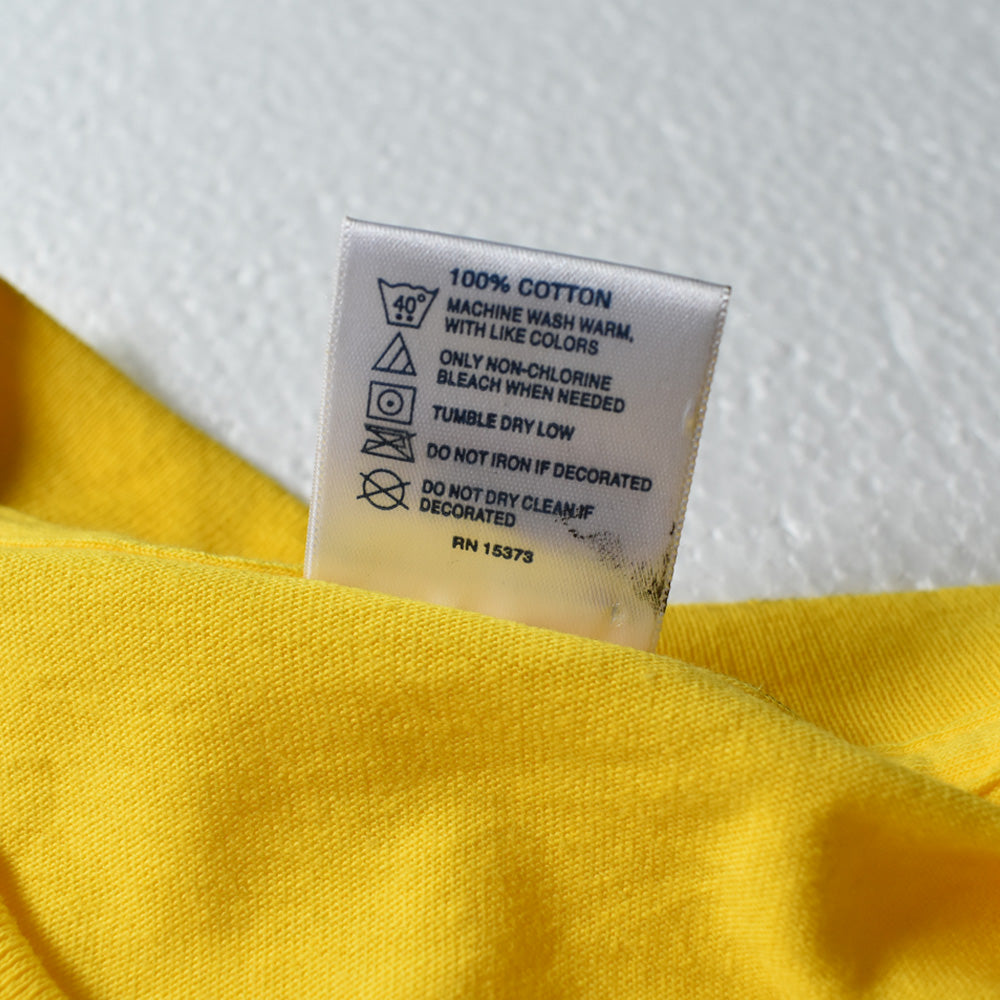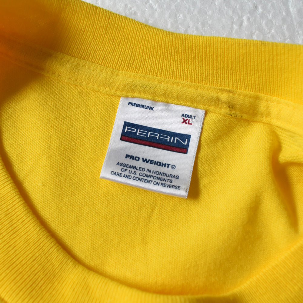 note...フロントに「CRIME DESIRE」の文字と女性の横顔をあしらったアートワークをプリントした一着。鮮やかなイエローボディに赤茶のスクリーングラフィックが映える、DIY感の強い仕上がりです。ボディは PERRIN PRO WEIGHT(100%コットン/XLサイズ)。タグ仕様から、2000年代に北米OEM市場で流通していた少量生産ボディと推定されます。