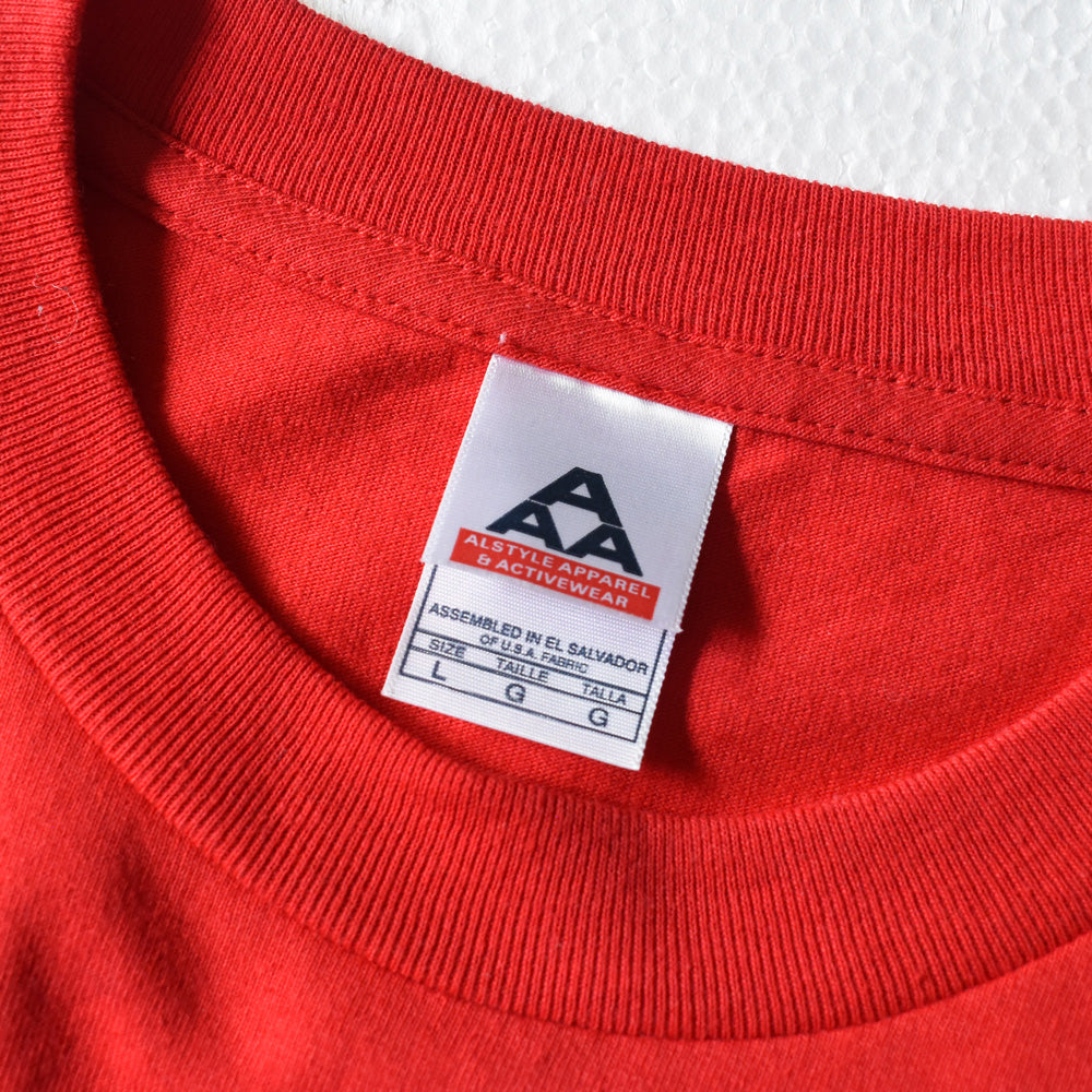note...アメリカ・ロサンゼルス発のグラインドコア/デスメタルバンド Excruciating Terror のTシャツ。1990年代から活動を続け、ハードコアとデスメタルの要素を融合した過激なサウンドで知られるバンドです。本アイテムは鮮烈なレッドボディにブラックのバンドロゴをフロントに配したシンプルなデザイン。ボディはALSTYLE APPAREL製、表記サイズL。近年流通のモデルながら、極端音楽カルチャーの強度をそのまま宿した一枚です。