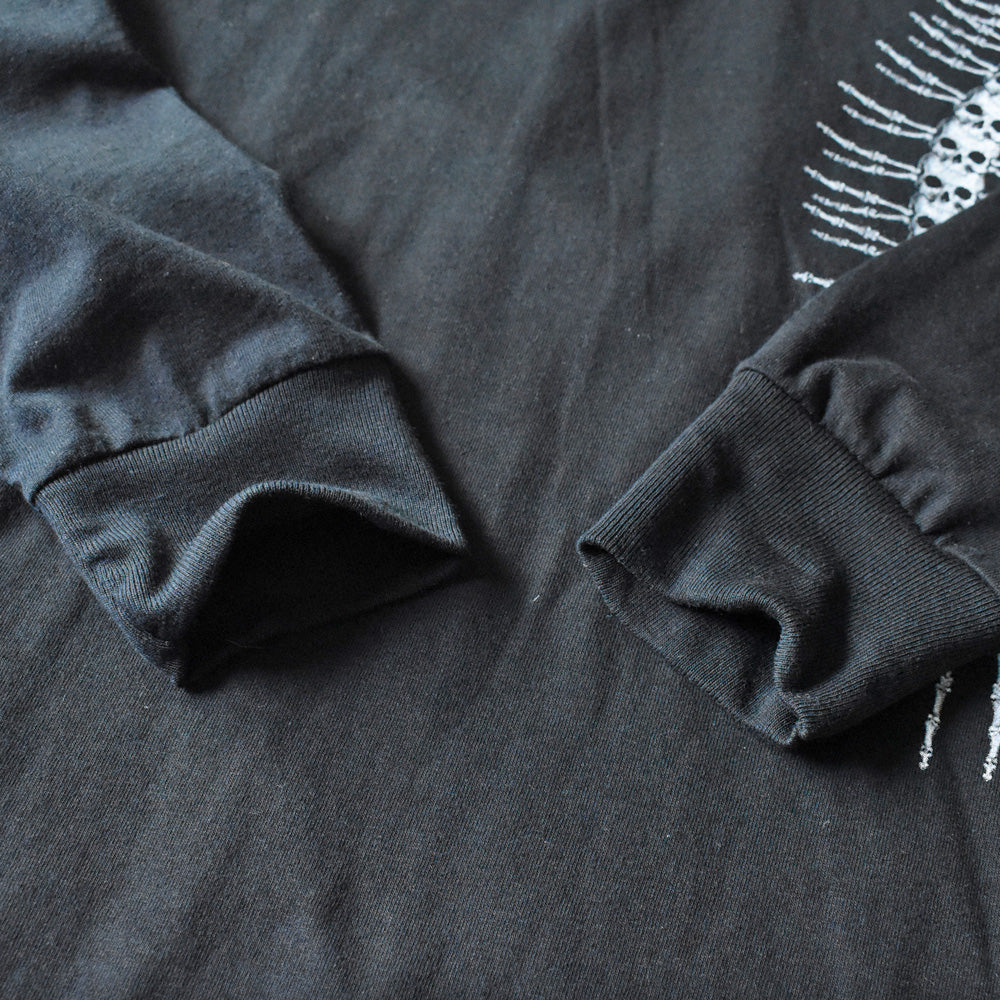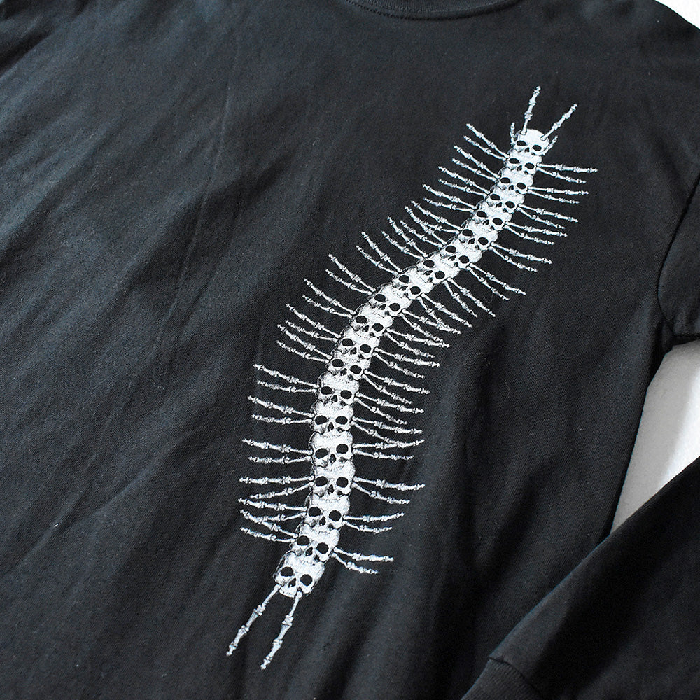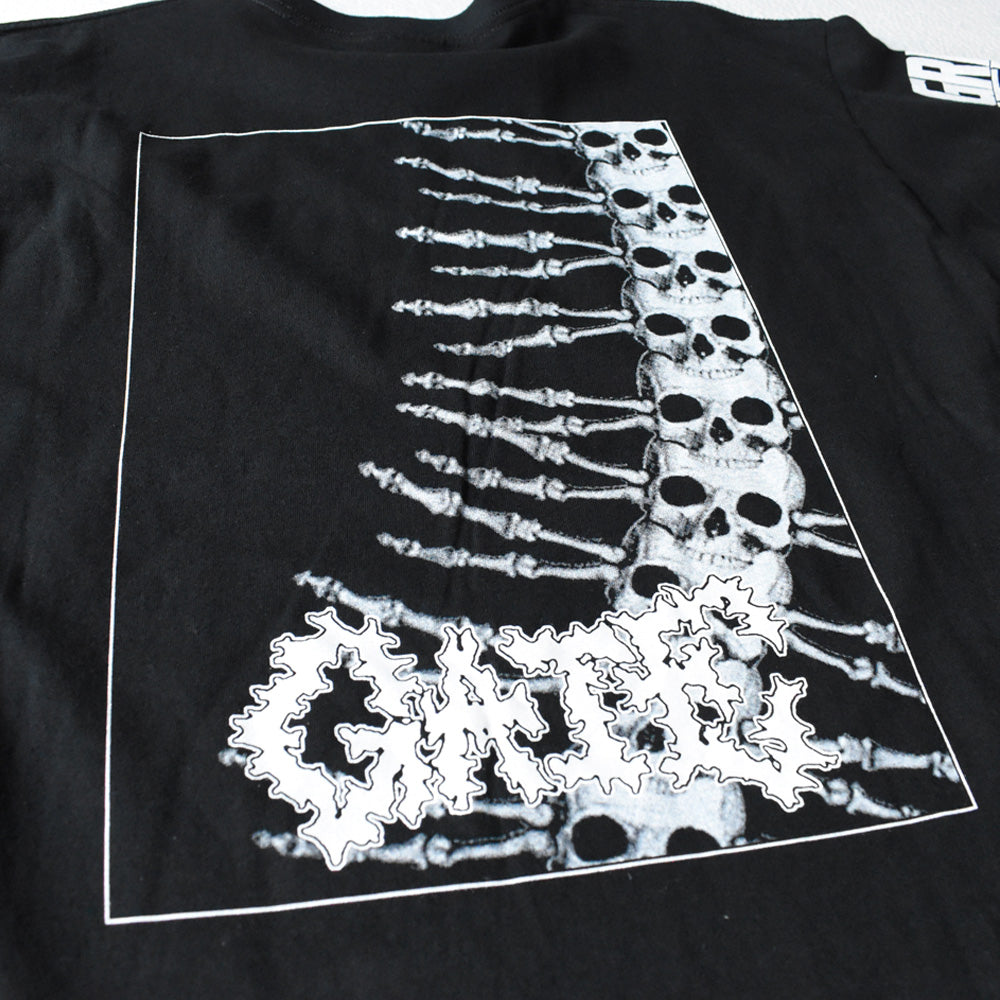 note...日本のグラインドコア/デスメタルバンド、GATEにのロングスリーブTシャツ。フロントにはバンドロゴと、頭蓋骨と骨を連結させてムカデ状に描いた強烈なアートワークをプリント。バックにも同モチーフを大胆に配置し、右袖には「GRIND ’EM ALL」とロゴが刻まれています。ボディはGILDAN Ultra Cotton、表記サイズL。国内外で支持を集めるGATEの攻撃的な世界観を体現したデザインで、グラインドコア/デスメタルファンにとってコレクション性の高いアイテムです。