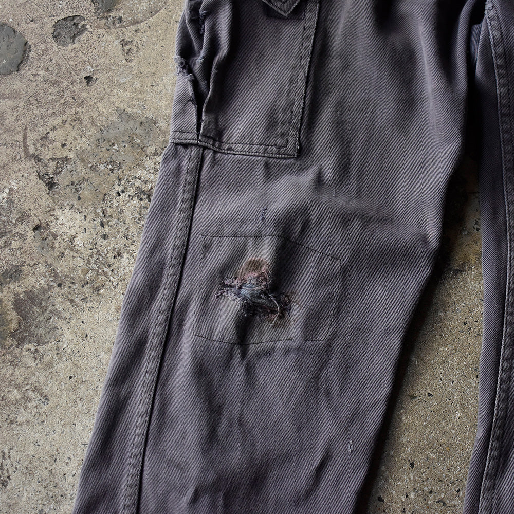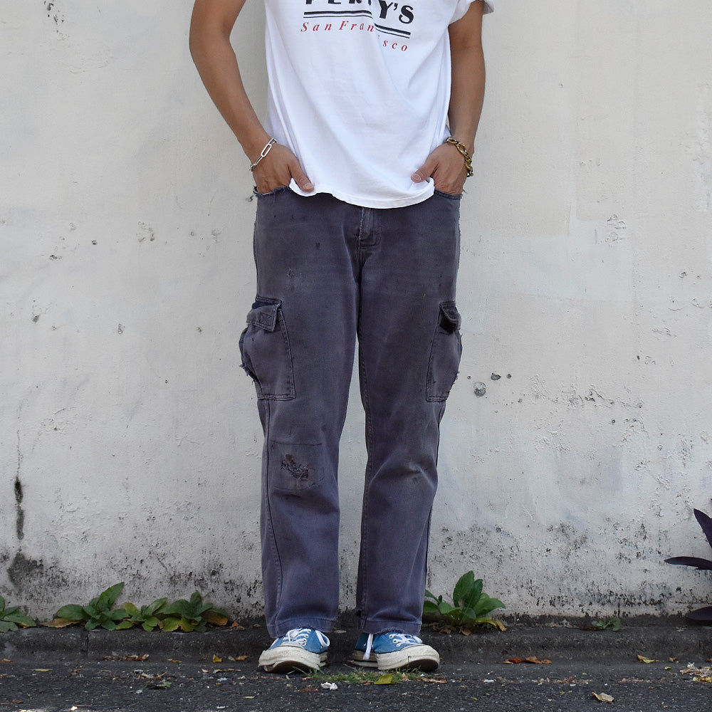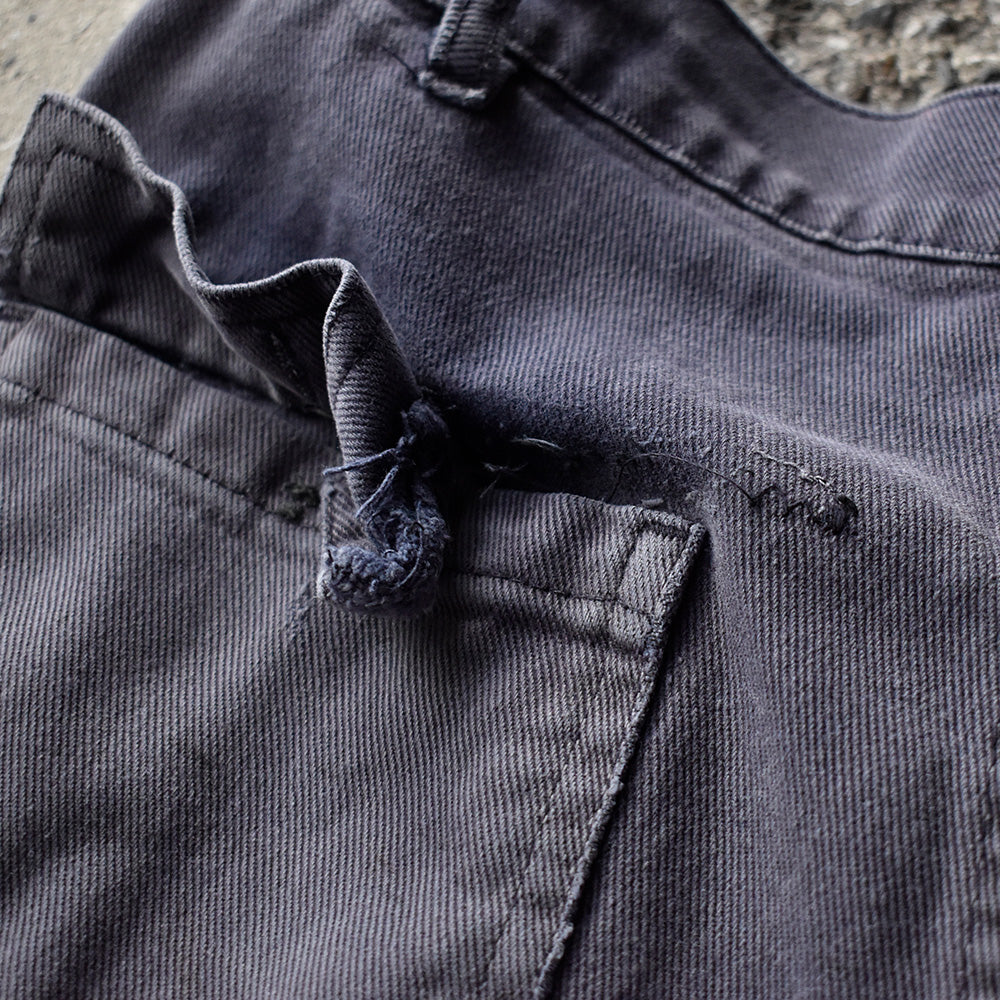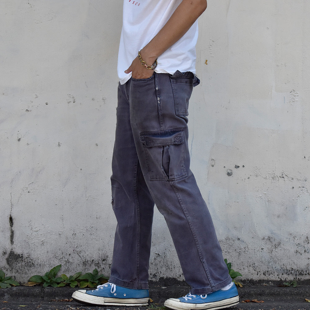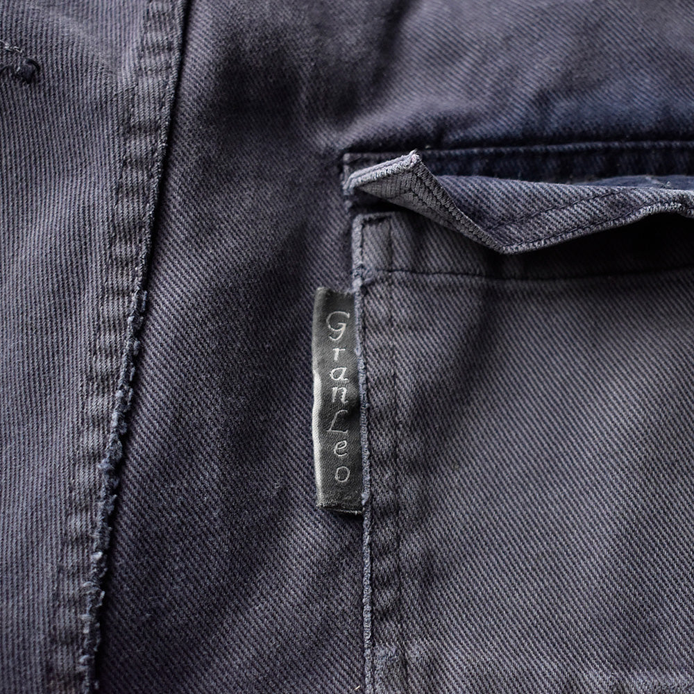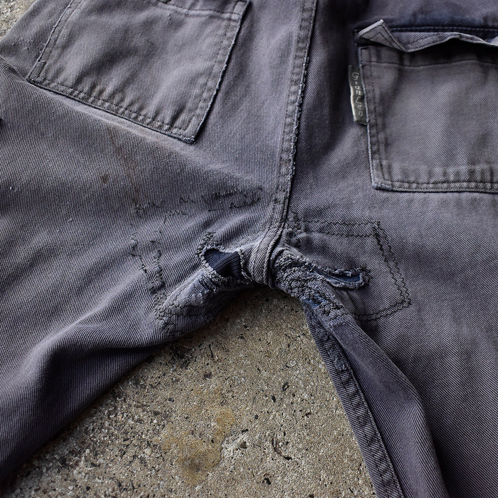 note...イタリアのワークウェアブランドGranLeo製、ユーロワークパンツ。コットンモールスキン素材に、美しくフェードしたネイビーカラー。カーゴタイプの6つポケット仕様。ボディ全体にダメージ多数、大きなリペア跡はありますが、この程よいボロこそが、リアルワークを感じさせてくれる最高にクールな1本!一味違った古着アイテムです!