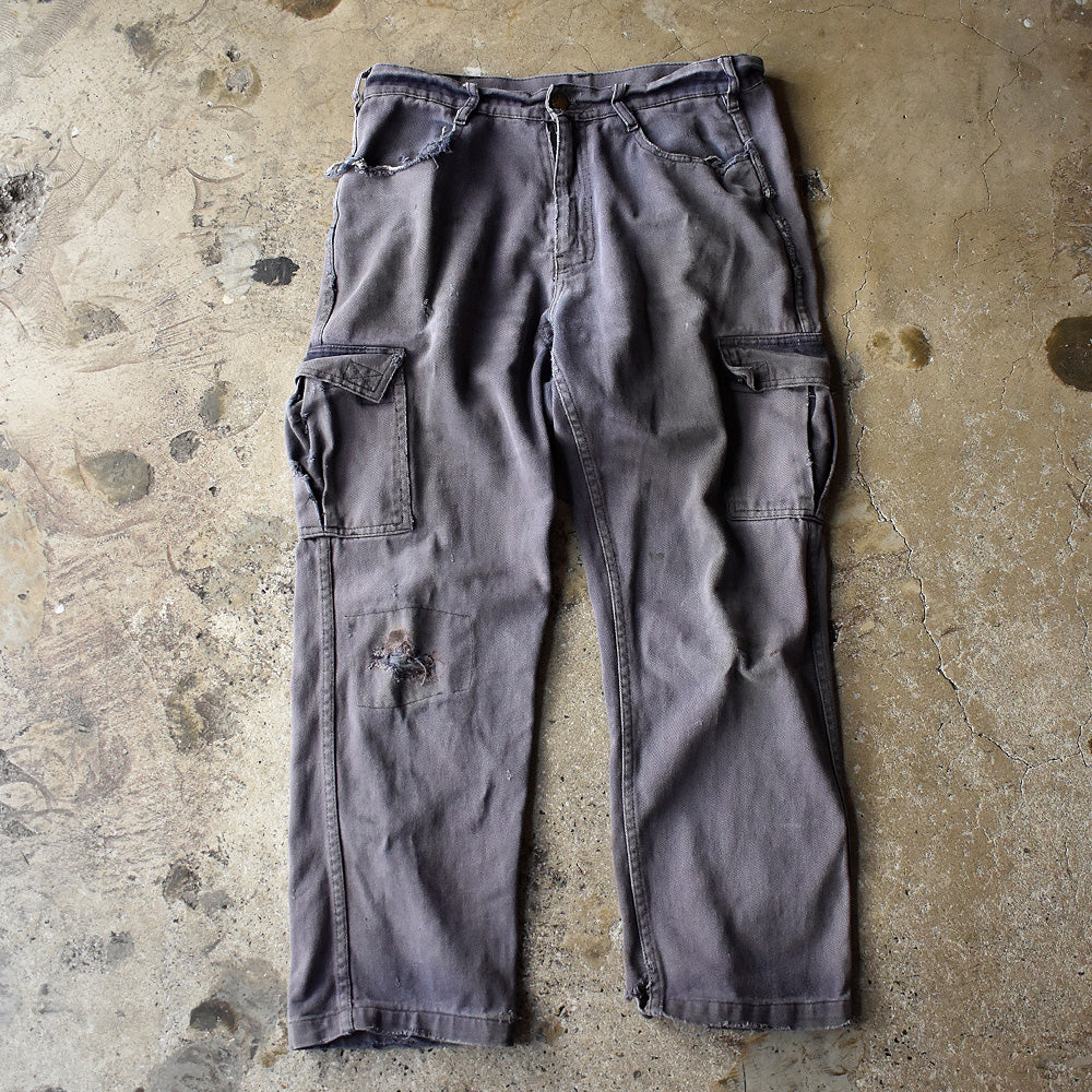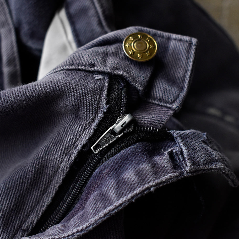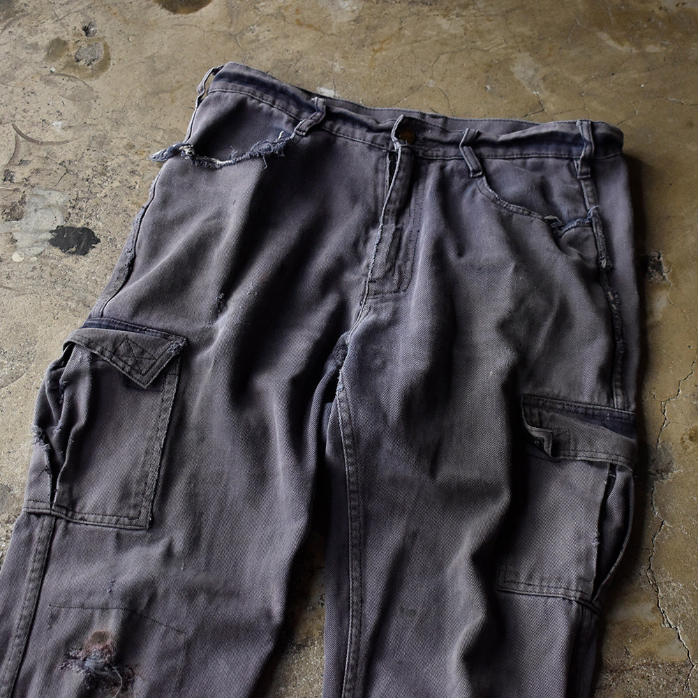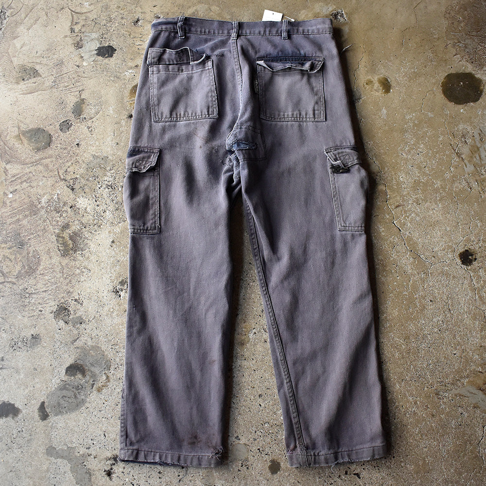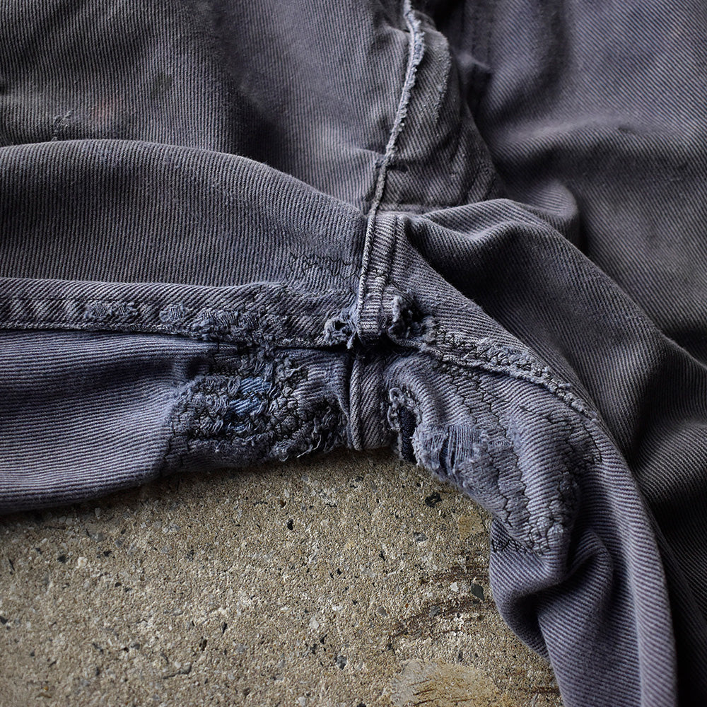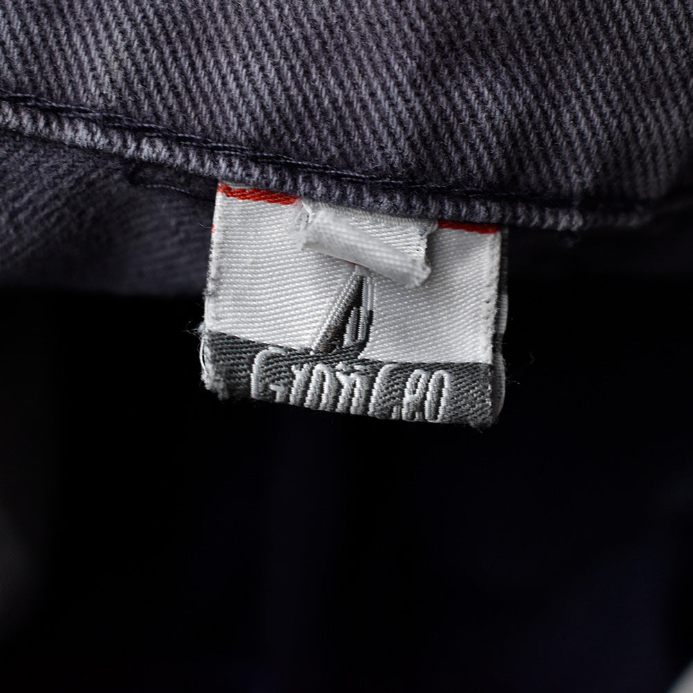 note...イタリアのワークウェアブランドGranLeo製、ユーロワークパンツ。コットンモールスキン素材に、美しくフェードしたネイビーカラー。カーゴタイプの6つポケット仕様。ボディ全体にダメージ多数、大きなリペア跡はありますが、この程よいボロこそが、リアルワークを感じさせてくれる最高にクールな1本!一味違った古着アイテムです!