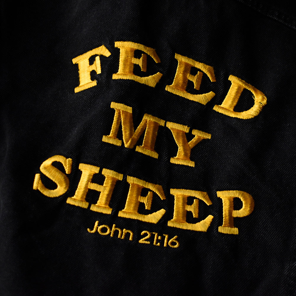 胸元には「Carter」「Man of God」の刺繍、そしてバックには聖書ヨハネによる福音書から引用された「FEED MY SHEEP(ヨハネ21:16)」のフレーズをゴールドの糸で大きくカスタム。信仰やスピリチュアルなメッセージを纏うことで、ストリートウェアとは異なる独自の存在感を放っています。