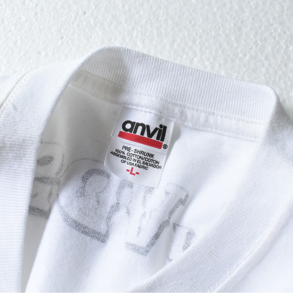 note...東京ハードコアパンクバンド、LOW VISIONのTシャツ。バンドロゴをフロントに大きくプリントし、バックには「LVDS」を配置したシンプルながら強烈なデザインが魅力です。ボディはnvil社製、表記サイズL。ホワイトボディにブラックロゴのストイックなコントラストは、今のストリートやロックスタイルにも自然に馴染み、ファッションとしても存在感を放ちます。デイリーユースにもおすすめの一枚。