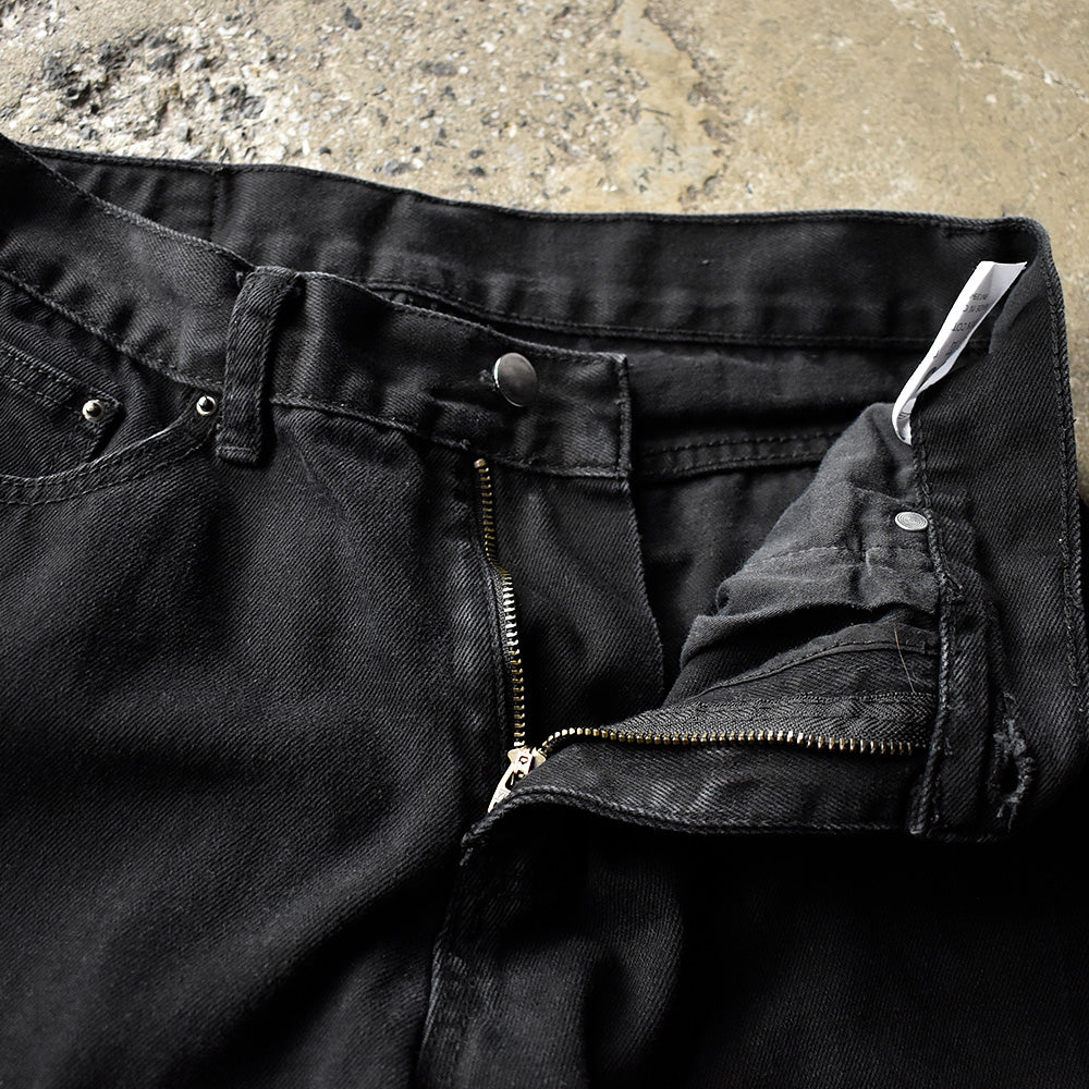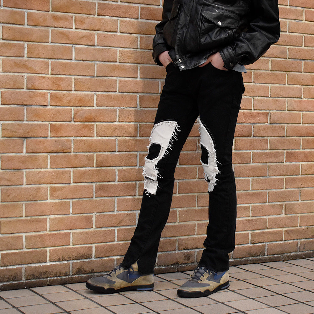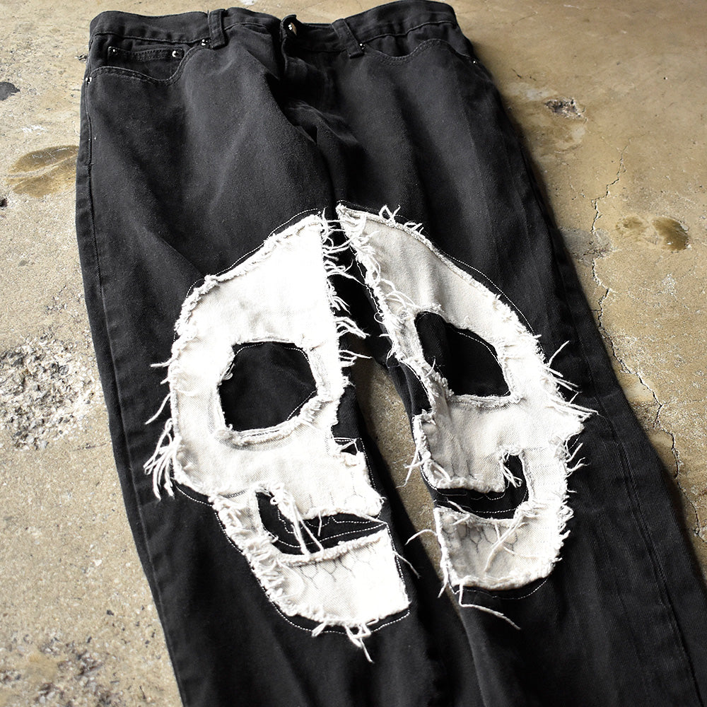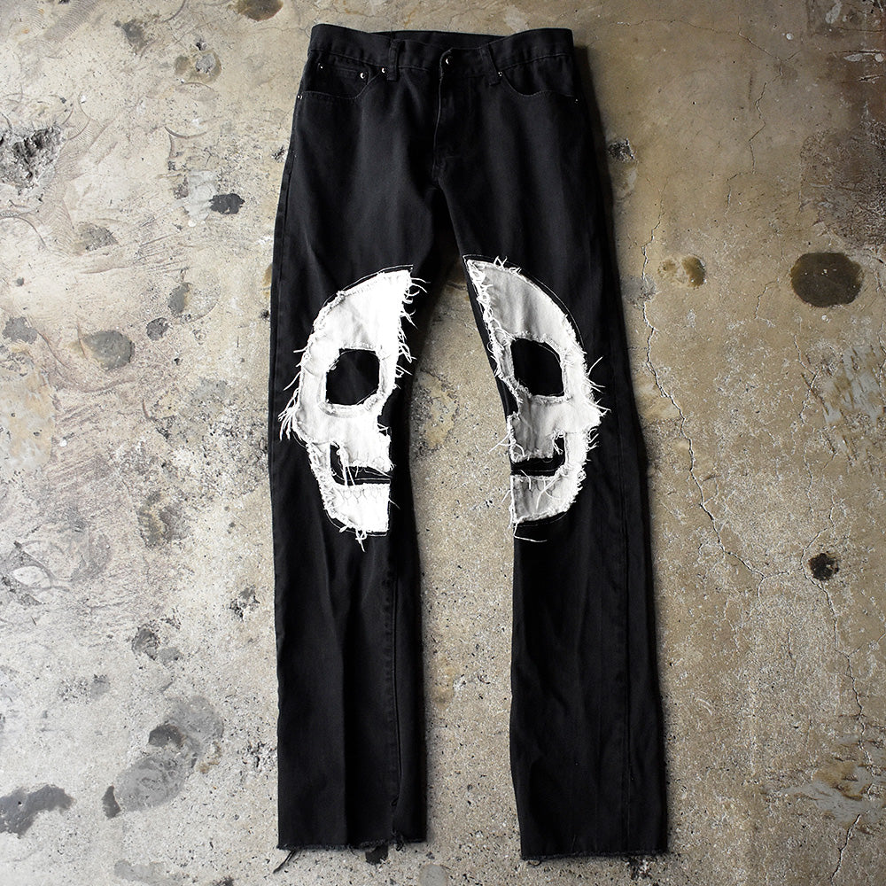 note...コットン100%、ブラックカラー、細身のスリムシルエットパンツ。フロントに入るスカルフェイスがインパント抜群の一本!実寸ウエストサイズは29インチ位。遊び心の効いたアイテムです。