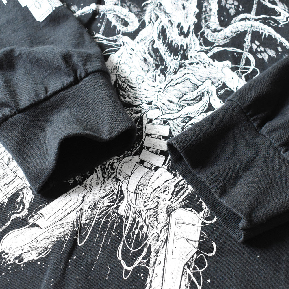 note...ニューヨーク発デスメタルバンド、Undeathの2021年北米ツアー「Decomposing North America」ロングスリーブTシャツ。フロントにはサイボーグが大型火器を構える禍々しいアートワークをプリント。バックにはツアータイトルと全都市・会場リストが並び、両脇に不気味なスケルトンモチーフを配置。右袖には大型銃器、左袖には「DECOMPOSING NORTH AMERICA 2021」の文字が入るフルデザイン仕様です。ボディはPort & Company「ESSENTIAL TEE」製、XLサイズ。シカゴ、ロサンゼルス、ダラスをはじめ約30都市を巡ったツアーを記録した一着で、当時の熱気を感じられる公式マーチャンダイズです。