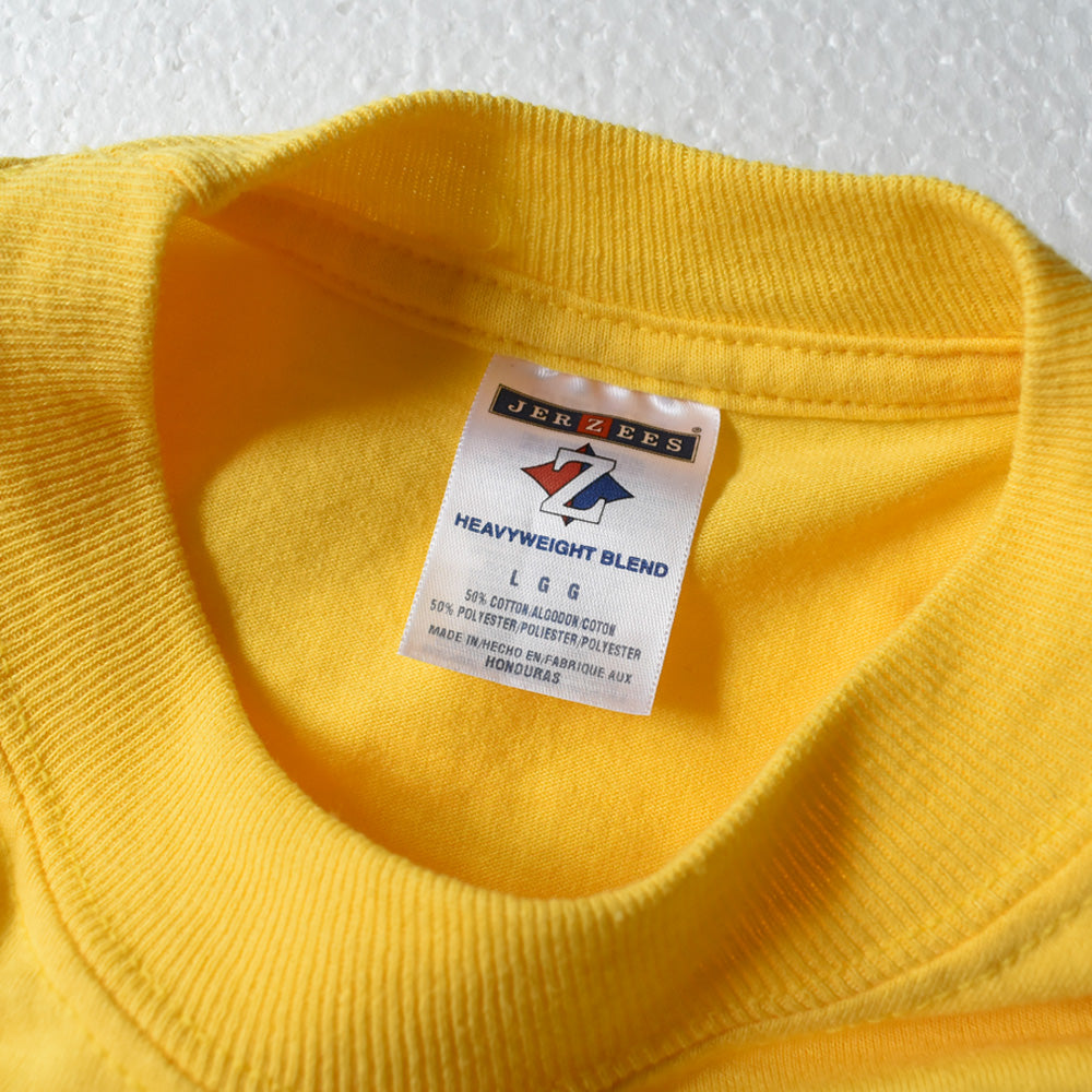 note...アメリカのパワーヴァイオレンス・バンド、Uzi SuicideのTシャツ。鮮やかなイエローボディにネオングリーンプリントで、フロントにはバンドロゴと「POWER VIOLENCE」の文字を配置。グラフィックはモハメド・アリ、アニメのメイドロボット、『ジョーズ』のサメを組み合わせたカオティックなコラージュで、ジャンル特有の過激さとユーモアを体現。ボディはJerzees製。タグ仕様から1997〜2005年頃の生産と推定され、当時のシーンの熱気とリンクするリアルな一枚です。情報が極めて少なく流通量も限られるため、パワーヴァイオレンス/ハードコアをコレクトするうえで高い価値を持つ希少アイテムです。