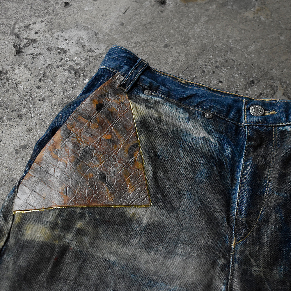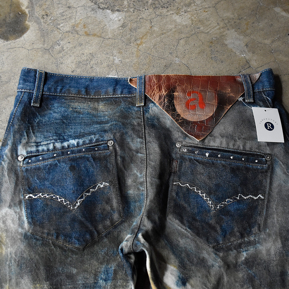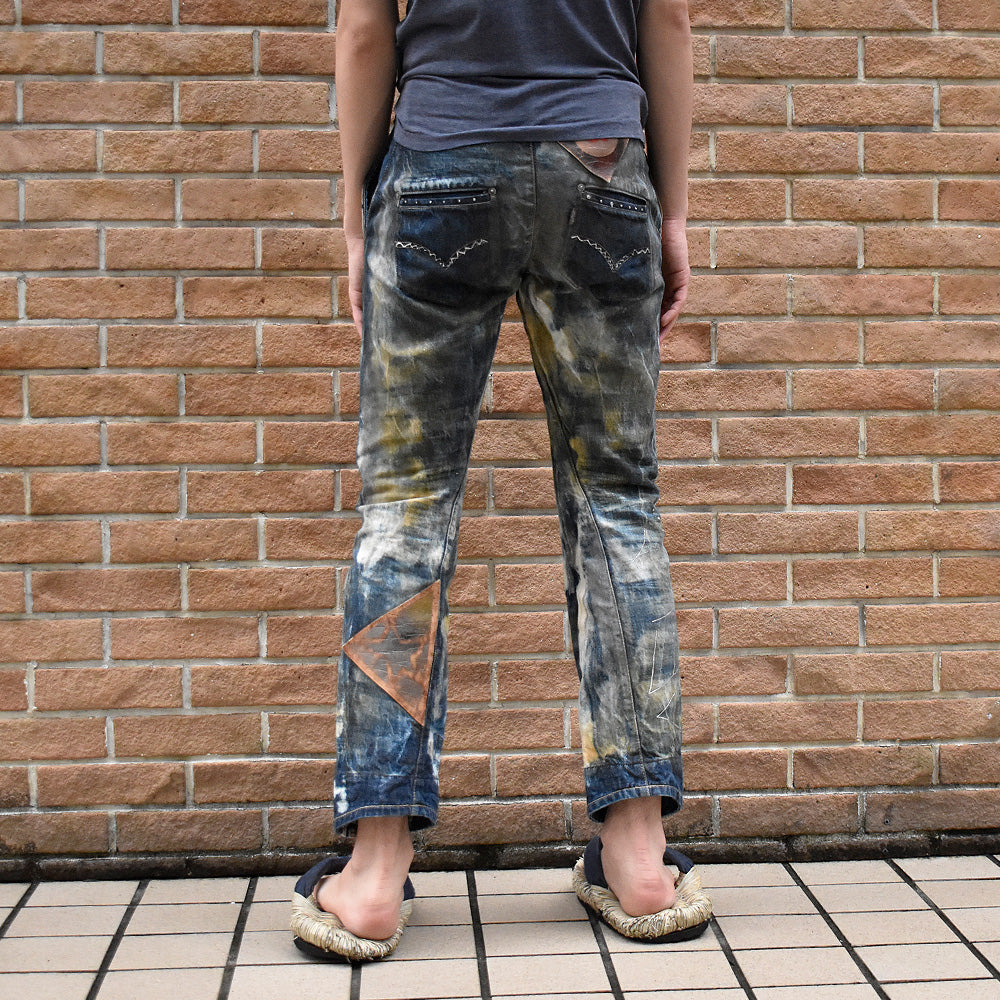 note... Levi’sエンジニアドジーンズ00016-0835、立体裁断デニムパンツ。Euro製。ボディ全体にペイント、パッチ、刺繍がカスタムされたパンチのあるリメイクLevi'sデニム!まさに00年代初頭の雰囲気を感じるクールな一本。実寸ウエストサイズは30インチ位。これぞ古着ならではの一点モノアイテムです。