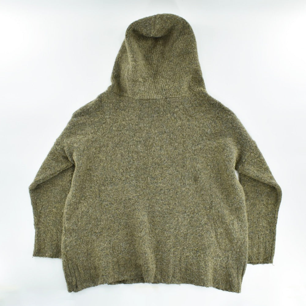フロントの大ぶりなカンガルーポケットが、ミニマルなニットの中にひとつだけ、ワークウェア的なリズムを刻んでいます。