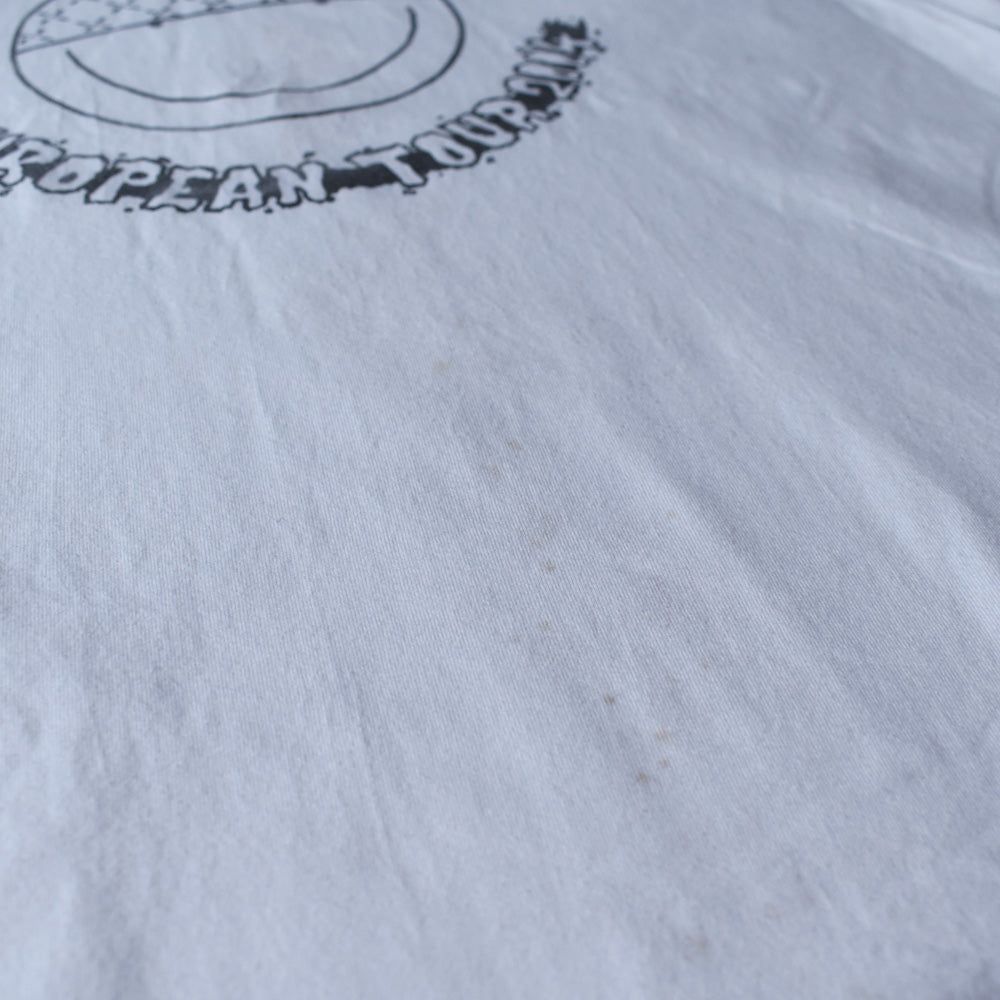 note...東京を拠点とするファストコア/ハードコアバンド、CRUCIAL SECTIONの2004年ヨーロッパツアーTシャツ。フロントにはバンダナを巻いたスマイリーフェイスを中心に「CRUCIAL SECTION」「EUROPEAN TOUR 2004」の文字が配置されています。シンプルながらパンキッシュでキャッチーなデザインは、彼らのストレートでスピーディな音楽性を視覚的に表現。ボディはUnited Sports Headline社製、Lサイズ。CRUCIAL SECTIONは国内外のハードコアパンクシーンで精力的に活動し、海外でも強い支持を得てきたバンド。本アイテムはその活動史を物語るアーカイブとして価値が高く、ファッションとしてもラフに取り入れやすい一枚です。