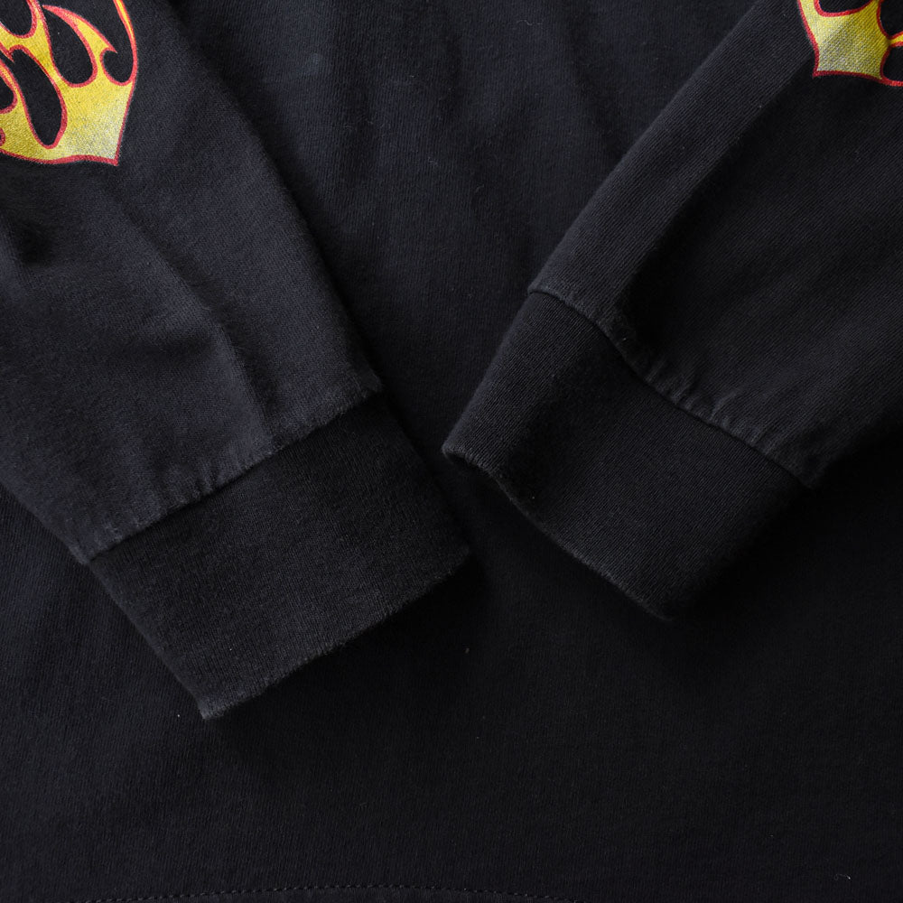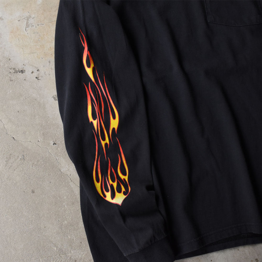 note....アメリカ・フロリダ州デイトナビーチで行われる世界最大級のバイクイベント“Daytona Bike Week 2002”のロングスリーブTシャツ。両面に加えて、袖にもプリントが入った豪華仕様。イベントの熱気をそのまま落とし込んだようなファイヤーパターンにも注目です!フェードしたブラックボディが古着らしいムードを存分に楽しめます。 表記2XLサイズのゆったりシルエット。1枚で着ても主役級の存在感を放ちます。