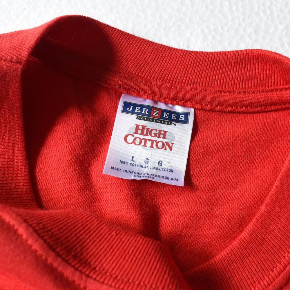 note...2000年代初頭、テキサス・ヒューストンで活動したパワーヴァイオレンス・バンド Machine Gun Romantics に関連すると推定されるTシャツ。赤ボディに黒プリントで、機関銃を構える人物とバンド名を大胆にレイアウト。ボディは「JERZEES High Cotton」タグで、デザインから1999〜2003年頃の製造と推定され、活動時期とも重なる点が特徴です。公式グッズかファンメイドかの断定は難しいものの、流通量が極めて少なく、現存数も限られるため高いコレクション価値を持つ一枚。パワーヴァイオレンス/ハードコアの熱気を感じさせる、当店が推すロックTカルチャーを象徴する逸品です。