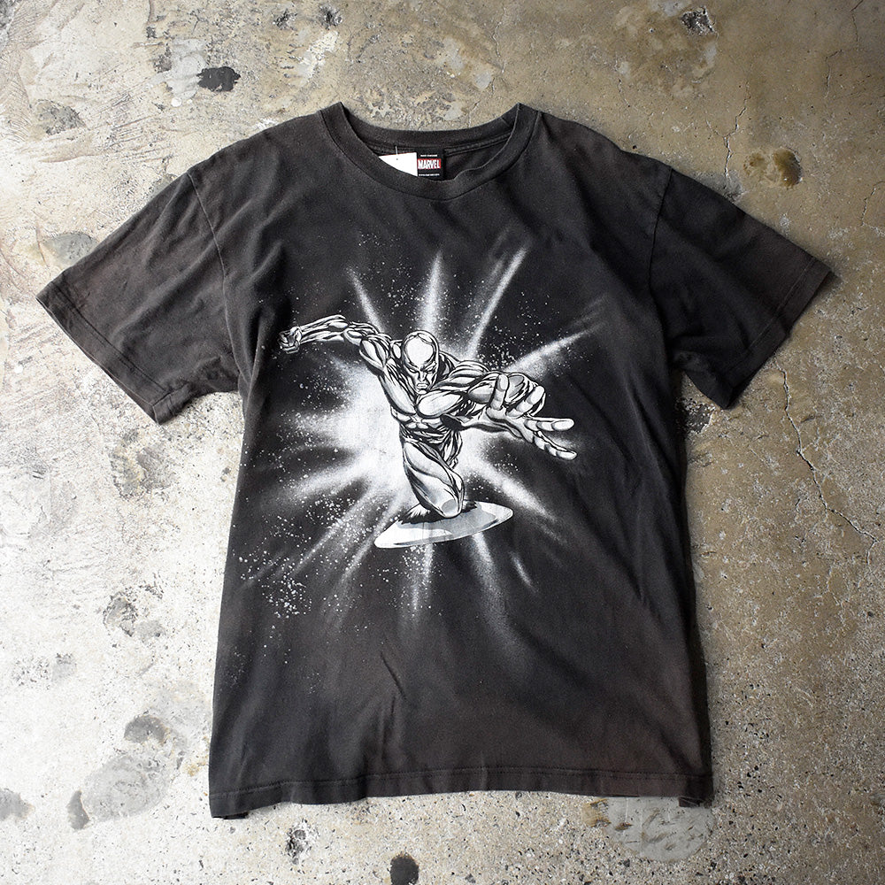 note...マーベル・コミックの中でもカルト的人気を誇るスーパーヒーロー“シルバーサーファー“。レアなシルバーサーファーTシャツです!ブラックボディに映える、モノクロのシルバープリントとダイナミックにサーフィンする名ポーズが目を引く1枚。ヤケ褪せしたフェード感のあるボディも古着ならでの風合い。タグはマーベルのL表記。国内、海外で大人気のキャラクターTシャツ。マーベルとなると尚更です!