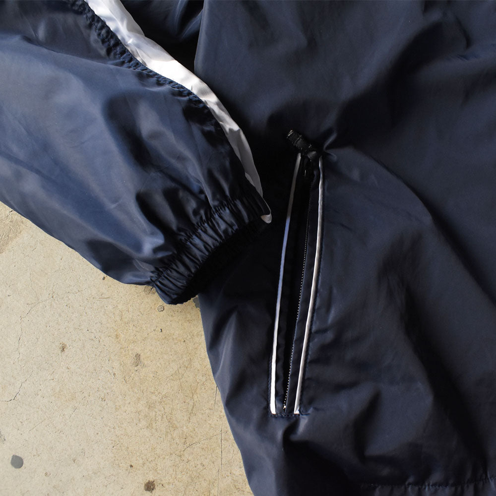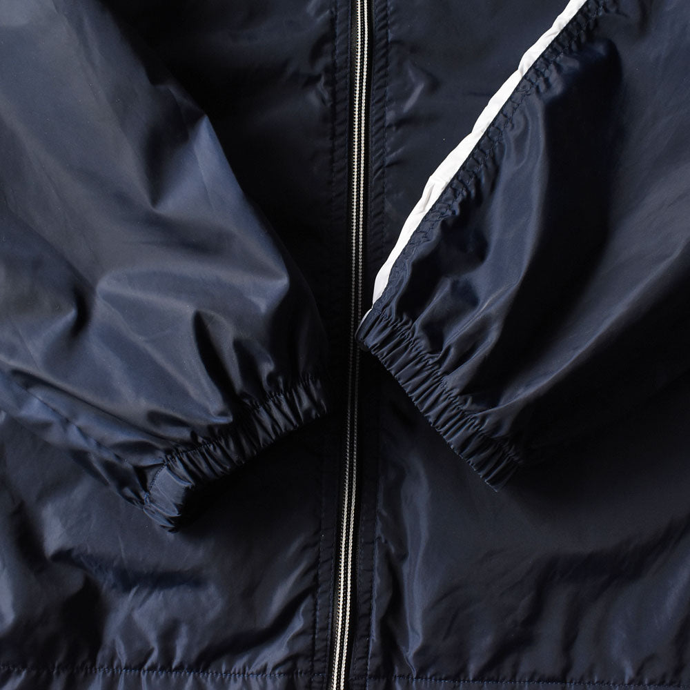 note...ネイビーのボディにホワイトのラインが映える、ナイキのトラックジャケット。左胸にはスウッシュロゴ、袖〜サイドには切り替えラインが走るデザインで、シンプルながら90年代〜2000年代らしいスポーツミックス感が漂う1着です。 シャツ襟仕様になっているため、スポーティーなアイテムながらクリーンに着られるのも魅力のひとつ。 ジャストでもオーバーサイズでも着回しが利く、万能なナイロンアウターです。
