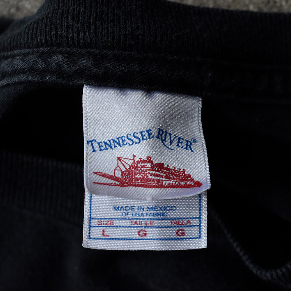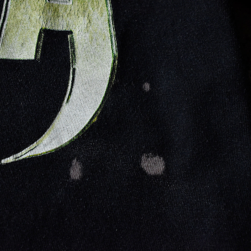 note...USヘヴィメタルバンド、パンテラ。スカルとマリファナリーフを大胆にミックスしたパンテラらしい攻撃的なグラフィックTシャツ。02年コピーライト入り。タグはテネシーリバーのL表記。国内外問わず高い人気を誇るパンテラ。おさえておきたい1枚です。
