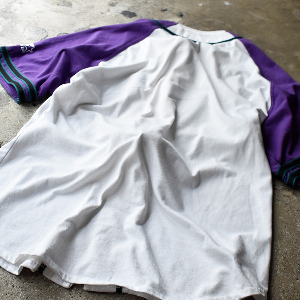 note...アメリカMLBチーム、アリゾナ・ダイヤモンドバックス。ポリエステル/コットン素材を使用したベースボールシャツ。パープル×ホワイトのナイスカラーリング。スターター製のL表記。ファッションのハズしアイテムとしてどうぞ!