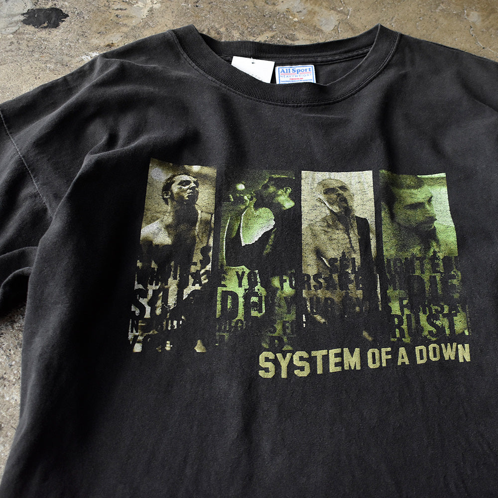 note...USニュー・メタルバンド、システム・オブ・ア・ダウン。01年リリースEP“Chop Suey!”頃のシステム・オブ・ア・ダウンTシャツ。フロントにメンバーフォトとジャケットで使用されたバンドのロゴデザイン。バック裾部分にもロゴがプリントされています。01年コピーライト入り。タグはAllSportのXL表記。メタル好き必見の1枚です。